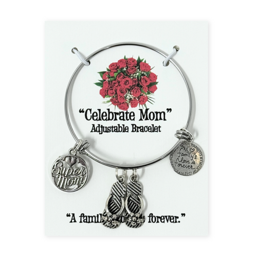 • Features three endearing charms including a "Super Mom" disc, a pair of detailed sandals, and a circular charm inscribed with "A family's love is forever."