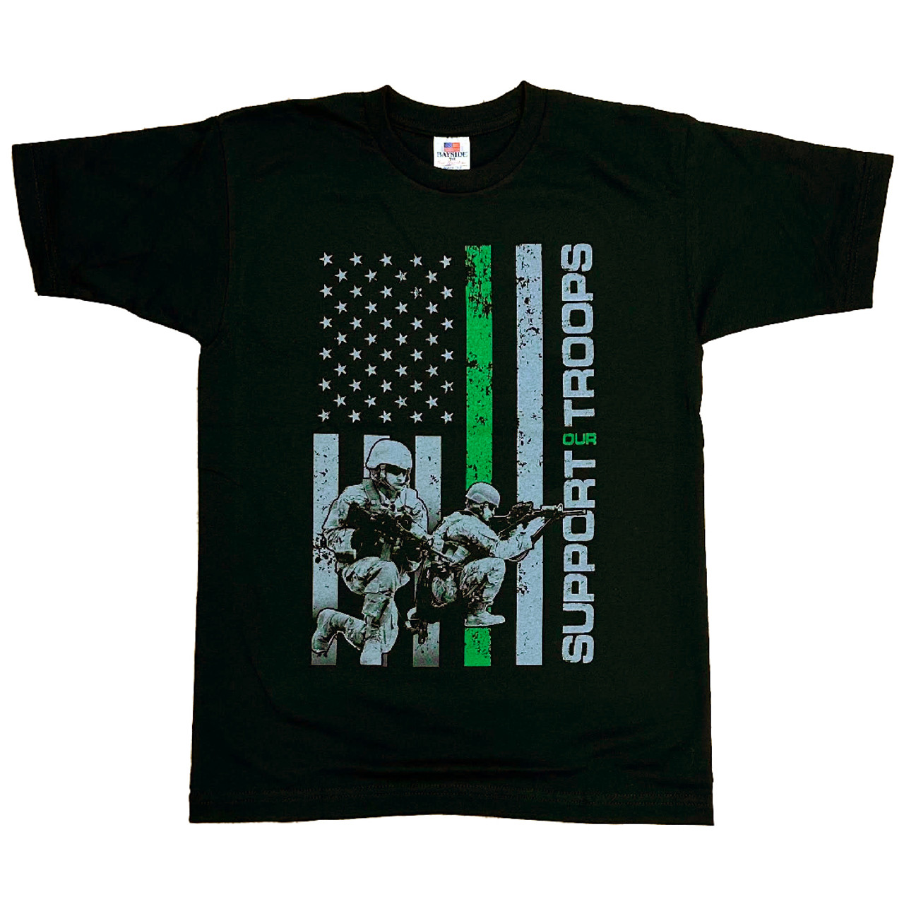 Adorning the side of the tee is the deeply resonant phrase: "Support Our Troops". This slogan amplifies the message of respect and gratitude for our military, reminding everyone who sees it of the importance of backing those who guard our freedom.