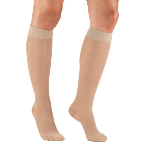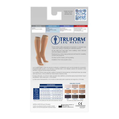 The Truform 1773 women's sheer compression stockings provide moderate, medical-grade support in a fashionable, sheer design. Available in black and nude, these knee-high stockings feature 15-20 mmHg of graduated compression, ideal for enhancing circulation, reducing leg fatigue, and alleviating discomfort from prolonged sitting, standing, or travel.