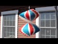 The red, white, and blue spinner is made from reclaimed (taken out of our kindling waste stream) hardwood maple and measures 8.5" wide and 11" tall, plus the sturdy spinning hardware. The printing is weather and UV resistant. It comes shrink-wrapped flat with swivel and hanging instructions.